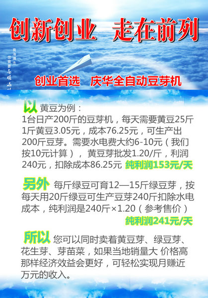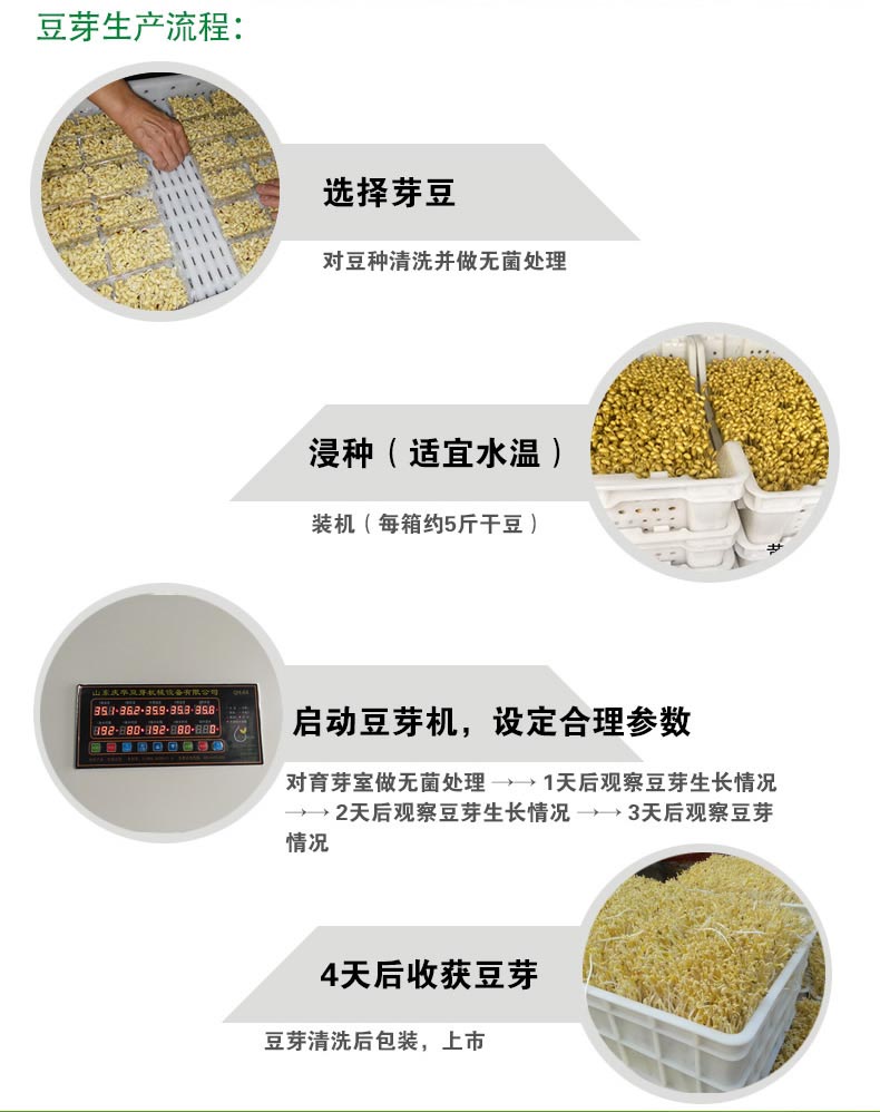 3、豆芽生產(chǎn)流程: 選擇芽豆 →→ 對(duì)豆種清洗并做無(wú)菌處理 →→ 浸種(適宜水溫) →→ 裝機(jī)(每箱約5斤干豆) →→ 啟動(dòng)豆芽機(jī),設(shè)定合理參數(shù) →→ 對(duì)育芽室做無(wú)菌處理 →→ 1天后觀察豆芽生長(zhǎng)情況 →→ 2天后觀察豆芽生長(zhǎng)情況 →→ 3天后觀察豆芽情況 →→ 4天后收獲豆芽 →→ 豆芽清洗后包裝,上市。